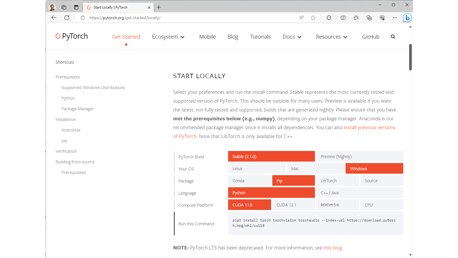 We gaan eerst een recente versie van PyTorch installeren dat nodig is voor Whisper. Ga daarvoor naar de website van PyTorch en kies de opties Stable, Windows, Pip, Python en CUDA 11.8. Kopieer het commando. In dit geval ziet dat er als volgt uit: