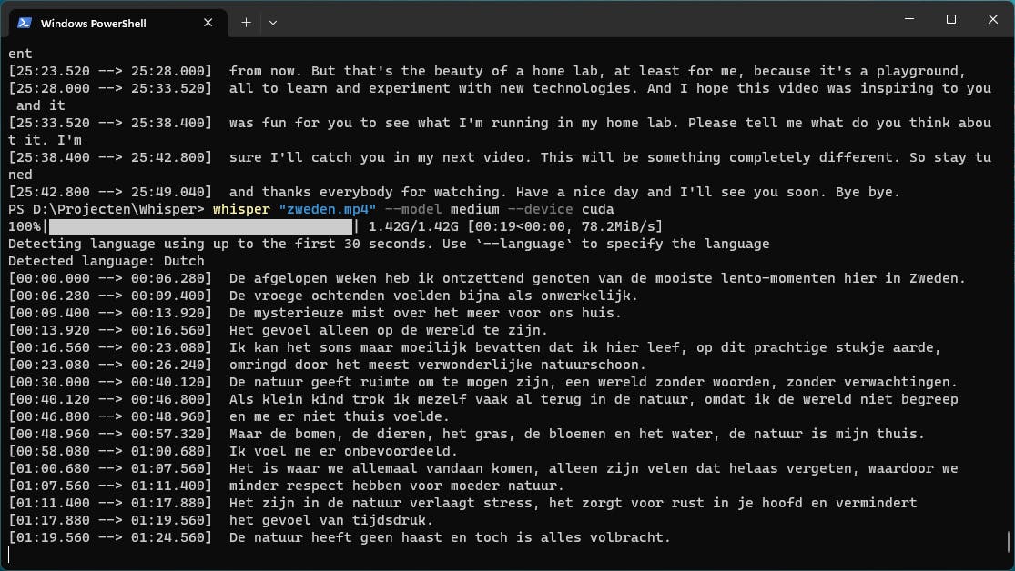 Voor de andere video’s gebruiken we --model medium. Dat is een meertalig model met hoge nauwkeurigheid. De taal zal steeds automatisch worden herkend: