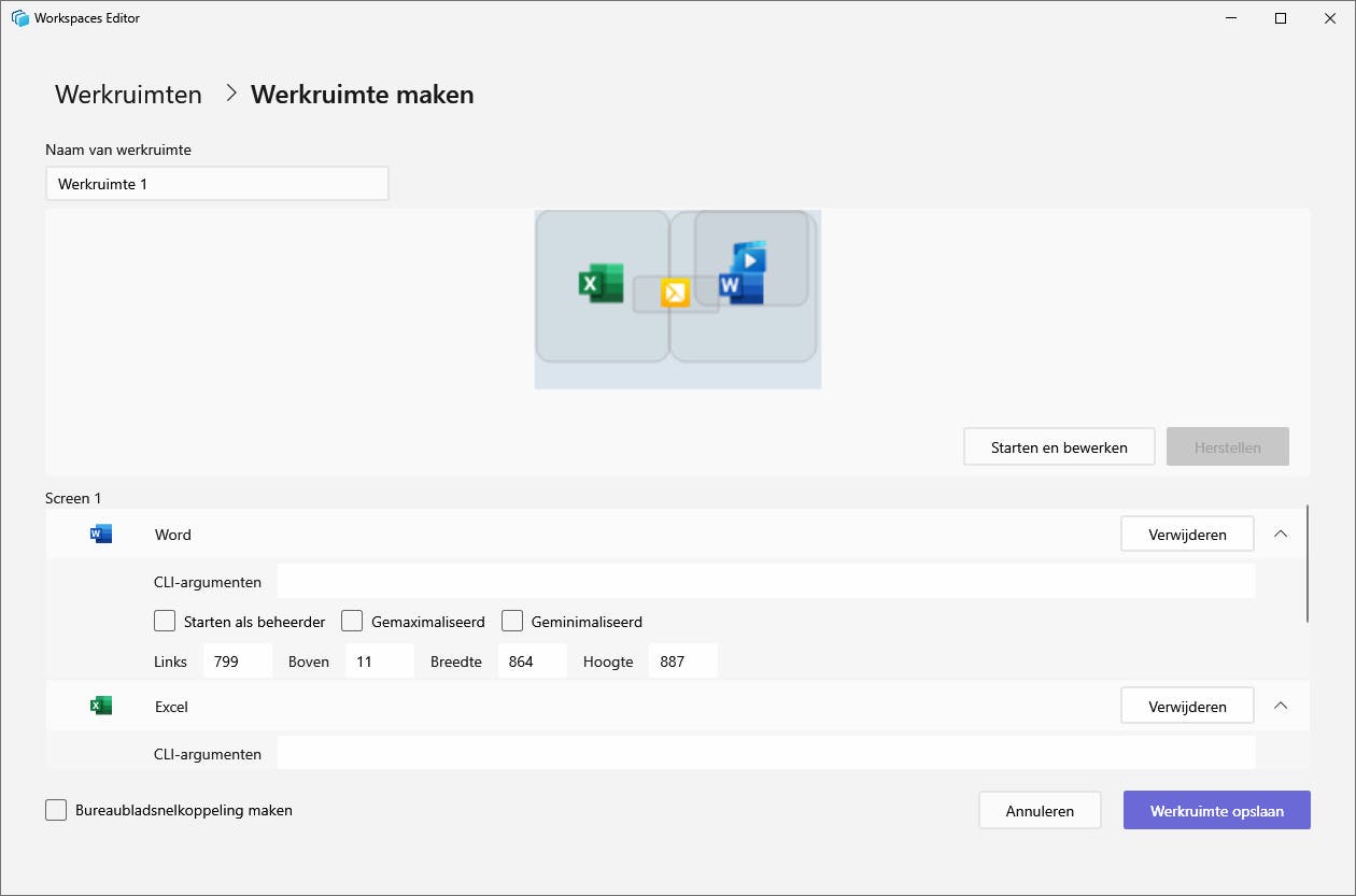 Open nu de programma’s die je gebruikt voor een bepaald project en verdeel de vensters van deze applicaties netjes over het bureaublad. Daarna gebruik je de toetscombinatie van Werkruimten. Hierdoor opent de Workspace Editor. Klik op de knop +Werkruimte maken. De editor vraagt of je de indeling van de programma’s nog wilt aanpassen. Ben je tevreden, dan klik je op Vastleggen. Geef deze nieuwe werkruimte een naam, bijvoorbeeld die van het project waaraan je werkt en klik op Werkruimte opslaan. Je kunt de apps die je niet nodig hebt verwijderen en vensterposities wijzigen. Per applicatie kun je ook aanduiden of het programma moet starten in admin-modus. Bovendien is het mogelijk om van deze werkruimte een snelkoppeling vast te leggen op je bureaublad. Ben je tevreden, dan bevestig je met Werkruimte opslaan.