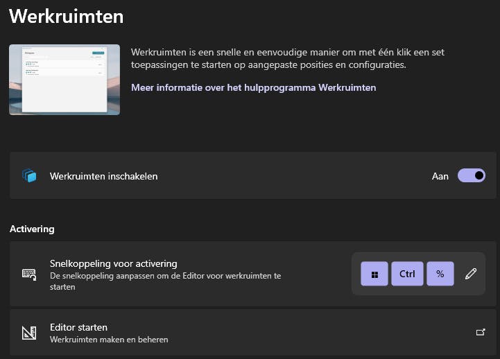 Het hulpprogramma Werkruimten is de nieuwkomer in PowerToys, de gratis Microsoft toolkit om Windows 11 (en 10) naar je hand te zetten. In deze set zitten ontzettend interessante functies, en Werkruimten is pas net aan de stabiele versie van PowerToys toegevoegd. Je haalt PowerToys binnen via de Microsoft Store en na de installatie vind je een schat aan hulpprogramma’s en functies in de linkerbalk. Wij hebben het hier uitsluitend over de onderste optie: Werkruimten. Schakel deze tool in, dan lees je de standaardsnelkoppeling om deze functie te activeren: Windows-toets+Ctrl+%. Wil je liever een andere combinatie, dan klik je op het potloodje.