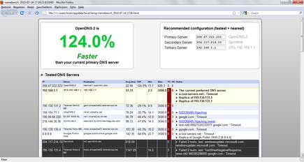 De test zelf duurt enkele minuten, en daarna krijgt u in uw browser een grafisch overzicht te zien van de resultaten. Daarin wordt een tabel getoond met de gemiddelde responstijd van elke dns-provider en een grafiek van de verdeling van diezelfde responstijden (omdat dat sterk kan variëren). Bovendien geeft Namebench u ook een concrete aanbeveling en toont het programma welke dns-servers u het best instelt en hoeveel procent sneller het vertalen van de domeinnamen daardoor gaat dan in uw huidige situatie.