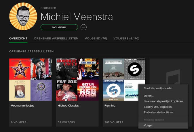 Als je graag een andere streamingdienst wilt proberen en je huidige muziekcollectie van de andere dienst mee wilt nemen, zorg dan voor wat overlap tussen de verschillende diensten. Om de afspeellijsten te kunnen exporteren, is vaak een lopend abonnement op de oude dienst nog vereist, iets wat geldt voor alle drie de populaire diensten. Alleen bij Spotify is er een omweggetje mogelijk. Als je toevallig iemand kent die ook Spotify Premium heeft, kun je vragen of hij of zij zich wil abonneren op je oude afspeellijst en kun je op die manier zo toch de muziek meenemen. Om je te abonneren de afspeellijst van iemand anders in Spotify, zoek je op die persoon en ga je naar Openbare afspeellijsten. Klik op de drie puntjes bij de afspeellijst als je er met de muis overheen gaat en kies voor Volgen.