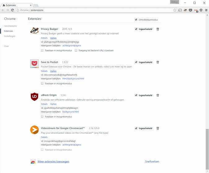 Je kunt alle extensies in Chrome controleren door op het icoontje met de drie streepjes te klikken (rechtsboven) en te kiezen voor Meer hulpprogramma's / Extensies. Een extensie schakel je uit door op het vinkje naast Ingeschakeld te klikken. Ook is het nodig om Google Play Music even in het Engels in te stellen. Hiervoor klik je op je gebruikersicoon rechtsboven en daarna op Mijn account. Kies voor Taal en invoertools en klik op Taal. Klik op Een andere taal toevoegen, selecteer English uit de lijst en klik op OK. Klik op het pijltje omhoog naast English om de taal als standaard in te stellen.