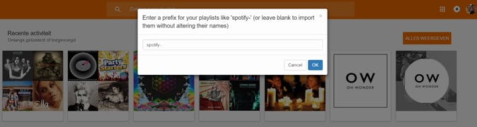 Ga terug naar Google Play Music en klik daar op OK. Plak het token en klik opnieuw op OK. Klik nu op My Spotify Playlists als je je eigen afspeellijsten wilt overzetten. Je kunt nu een voorvoegsel invullen voor je afspeellijsten, zodat je weet welke vanuit Spotify afkomstig zijn. Je kunt dit veld ook leeglaten. Wij vullen spotify- als voorvoegsel in en klikken opnieuw op OK. De afspeellijsten worden nu geïndexeerd.