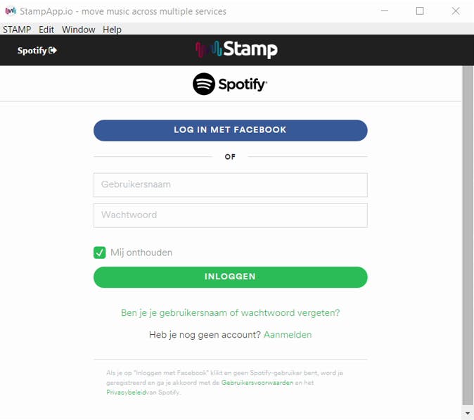 Je downloadt Stamp hier. Klik op de groene knop Free Download. Voer het gedownloade bestand uit en klik op Install. Na de installatie klik je op Finish waarna Stamp zichzelf automatisch opent en je kunt beginnen. Als eerste kies je de betreffende dienst van waaruit je wilt exporteren. In ons geval kiezen we Spotify door op dat logo te klikken. Er wordt gevraagd om in te loggen, klik op Log in op Spotify. Vul je gebruikersnaam en wachtwoord in en klik op Inloggen om door te gaan. Klik daarna op OK om Stamp toegang te geven tot jouw afspeellijsten op Spotify.