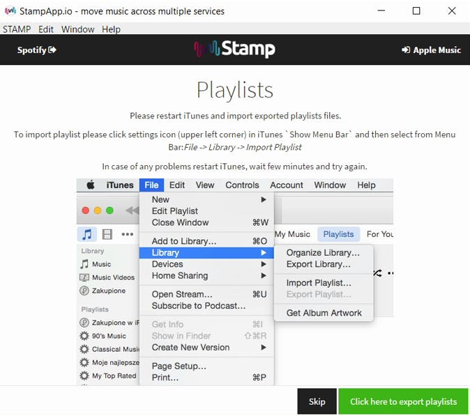 Zijn de afspeellijsten eenmaal in beeld, vink dan degene die je wilt overzetten aan en klik op Next. Nu begint het overzetten, waarna de nummers met ongeveer een halve minuut vertraging in iTunes verschijnen. Daarna verschijnt de melding om de afspeellijsten te exporteren. Tot nu toe heeft Stamp namelijk alleen de muziek toegevoegd aan je Apple Music-collectie. Stamp kan niet zelf de afspeellijsten aanmaken. Om de afspeellijsten te importeren, klik je op Click here to export playlists in Stamp en kies je een handige locatie om de muziek in op te slaan. Vervolgens open je iTunes en druk je op de Alt-toets om de menubalk te laten verschijnen. Klik nu op Bestand / Bibliotheek / Afspeellijst importeren en selecteer je het bestand in de vorm van playlists-[willekeurige letters en cijfers].xml en klik op Openen. Je ziet de nieuwe afspeellijst verschijnen.