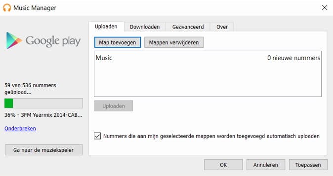 Wij kiezen voor Andere mappen, maar je kunt rustig een andere optie selecteren. Bij Andere mappen klik je op Map toevoegen en blader je naar de locatie van je muziek. Klik daarna op Volgende. De Music Manager geeft aan hoeveel nummers er zijn gevonden en hoeveel je er nog kunt uploaden. Klik op Volgende. Je kunt er nu voor kiezen om in de toekomst nummers automatisch toe te voegen aan je online bibliotheek van Google Play Music. Klik op Ja als je gebruik wilt maken van deze functie en klik op Volgende om het uploaden te starten. Klik op Sluiten waarna het proces in de achtergrond doorgaat.