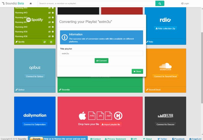 Als je je muziek graag wilt matchen met je lokale muziekcollectie in Spotify, dan kun je gebruik maken van http://soundiiz.com. Deze website kan overweg met Spotify, YouTube, SoundCloud, Deezer, Napster, Groove Music van Microsoft én lokale afspeellijsten in een aantal formaten, waaronder m3u. De site matcht muziek in de afspeellijst met die op de streamingdienst. In dit geval willen we onze muziek verplaatsen van een m3u-formaat, lokaal, naar Spotify. Op de website klik je als eerste rechts op Start converting en daarna op de dienst waar naartoe je wilt importeren.