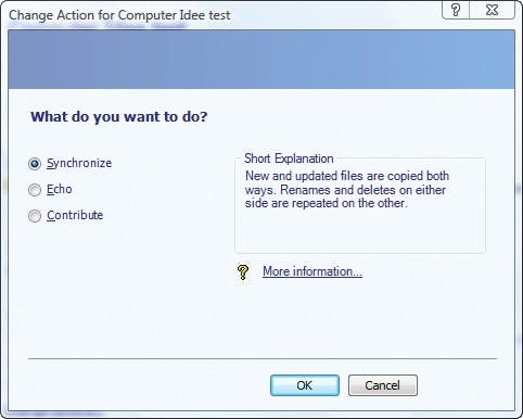 Vervolgens krijgt u drie opties: Synchronize, Echo en Contribute. Bij de eerste wordt de inhoud van twee mappen gelijk gehouden. Bij Echo worden alleen de bestanden van één map, naar een andere locatie gekopieerd; een backup eigenlijk, waarbij hernoemde en verwijderde bestanden worden bijgewerkt. Contribute is hetzelfde als Echo, alleen worden er geen bestanden verwijderd. In dit geval kiezen we dus voor Synchronize.