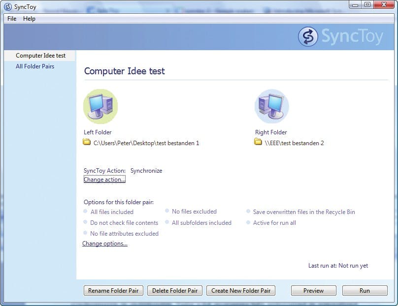 Nu laat het programma in een overzicht uw instellingen zien. U hebt nu één mappenpaar (Folder Pair) aangemaakt, maar u kunt ook meerdere mappen met elkaar laten synchroniseren. Voordat u het programma z'n gang laat gaan, toont een klik op Preview u desgewenst welke handelingen het programma gaat verrichten. De software laat dan precies zien welke bestanden worden bijgewerkt. Bent u het er niet mee eens, dan kunt u dat nu nog wijzigen. Klik tenslotte op Run om de actie uit te voeren.