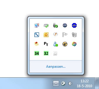 Een pictogram verbergen kan ook door hem met de muis uit het systeemvak te verslepen. U laat hem gewoon ergens op het bureaublad vallen, of op het venstertje met verborgen pictogrammen dat tijdens het slepen vanzelf verschijnt. Andersom is een pictogram vanuit het venster met verborgen pictogrammen terug naar het systeemvak te slepen. Tot slot mag u van Windows 7 met pictogrammen slepen om zelf de volgorde te bepalen. Het werkt zowel in het systeemvak als in het venster met verborgen pictogrammen.