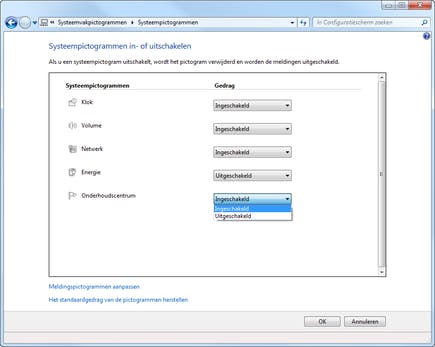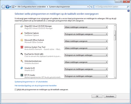 Om in te stellen of pictogrammen al dan niet in het systeemvak terechtkomen, klikt u onderin het venstertje op Aanpassen. In een nieuw venster ziet u een lijst met pictogrammen met elk een korte omschrijving. Klik bij een pictogram in de kolom Gedrag om een keuze te maken in het snelmenu. Het pictogram verschijnt direct in het systeemvak zodra het programma draait, als u het gedrag instelt op Pictogram en meldingen weergeven. Wilt u het pictogram alleen zien als het programma een belangrijke mededeling heeft, kies dan voor Alleen meldingen weergeven. Tot die tijd blijft het pictogram dan verborgen.