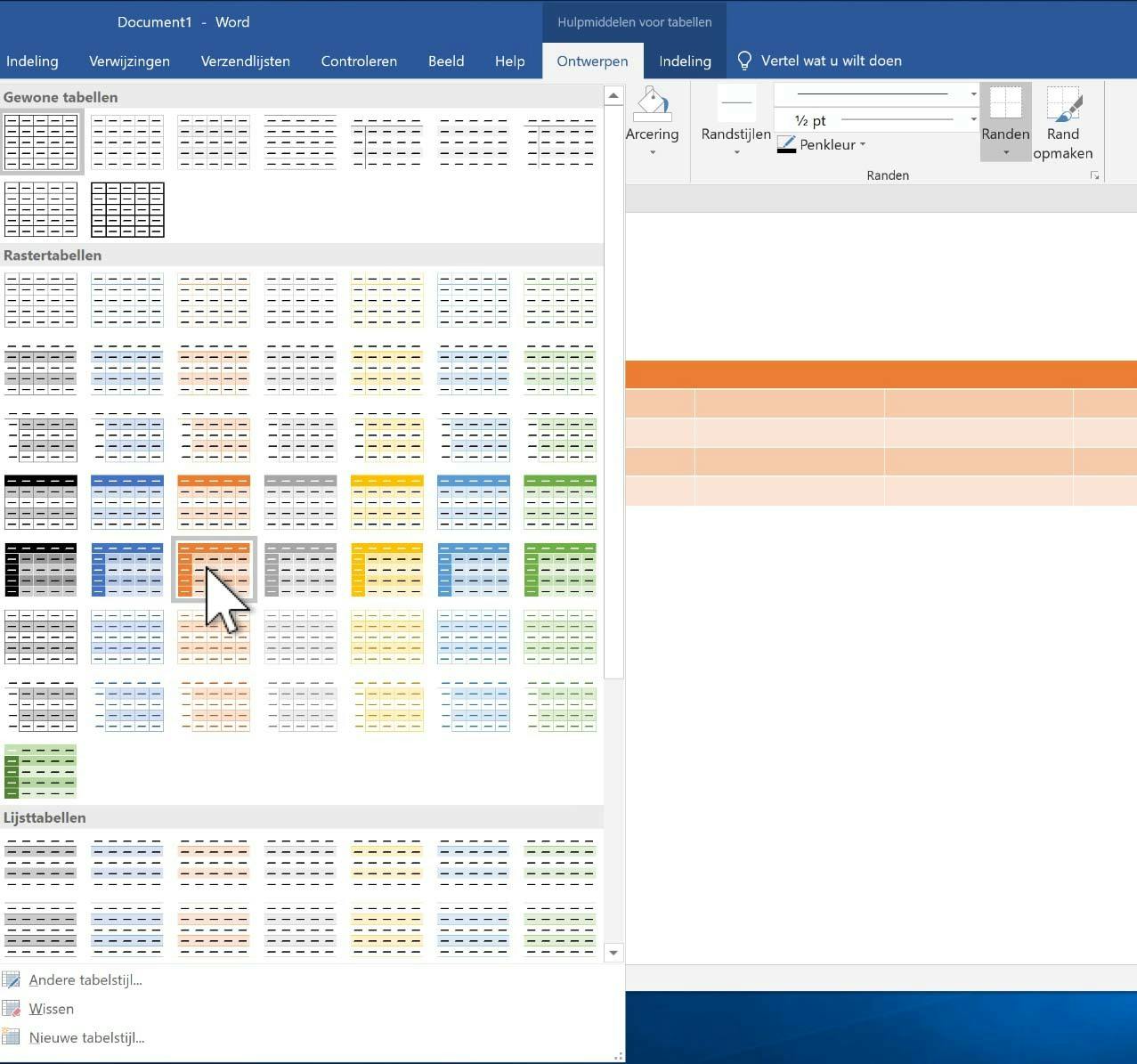 Nu ziet deze standaardtabel er wel zorgwekkend saai uit. Opmaken is echter geen enkel probleem. Je kunt gebruik maken van een van de voorgedefinieerde tabelstijlen. Klik daarvoor - met de tabel geselecteerd - in het lint onder Hulpmiddelen voor tabellen op Ontwerpen. Klik dan op het kleine, naar beneden gerichte pijltje rechts onderin het blok met voorbeelden en kies iets van je gading. Wil je het helemaal bont maken, dan kun je ook handmatig een tabel naar wens aanpassen. De lijndikte van het kader en de afzonderlijke cellen is aan te passen door eerst de hele tabel te selecteren (via een klik op knopje linksboven aan de tabel) en dan - weer onder Hulpmiddelen voor tabellen en Ontwerpen - op het naar beneden gerichte pijltje onder de knop Randen te klikken. Je kunt nu zelf aangeven welke randen wel en welke niet getekend worden. Lijndikte- en kleur zijn aanpasbaar via de daarvoor bestemde selectieknoppen.