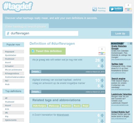 Interessant is dat de dienst ook definities heeft voor populaire Nederlandse hashtags zoals #durftevragen of #nn-open bijvoorbeeld. Ook handig is dat Tagdef enkele top tiens maakt: Trending tags, New tags, Top today, Top this week en All time high.