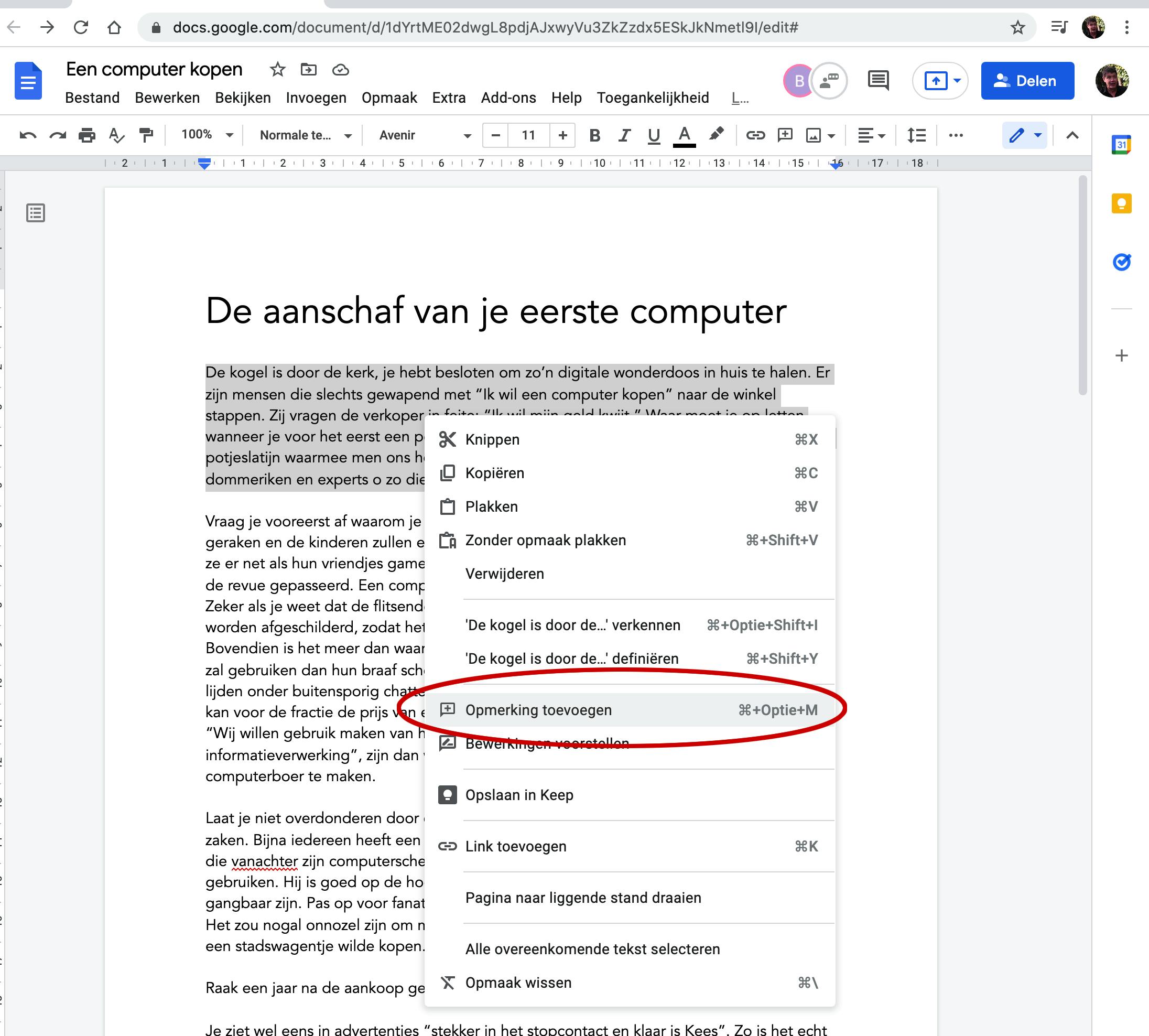 Nadat je het document hebt gedeeld, zie je bovenaan de pictogrammen van de mensen die aan dit document werken. Stel dat je aan een collega wilt vragen om de inleiding in te korten, dan selecteer je het woord of de tekst waarvoor de taak geldt (in dit geval de inleiding) en klik je met de rechtermuisknop op de geselecteerde tekst, waarna je kiest voor Opmerking toevoegen.