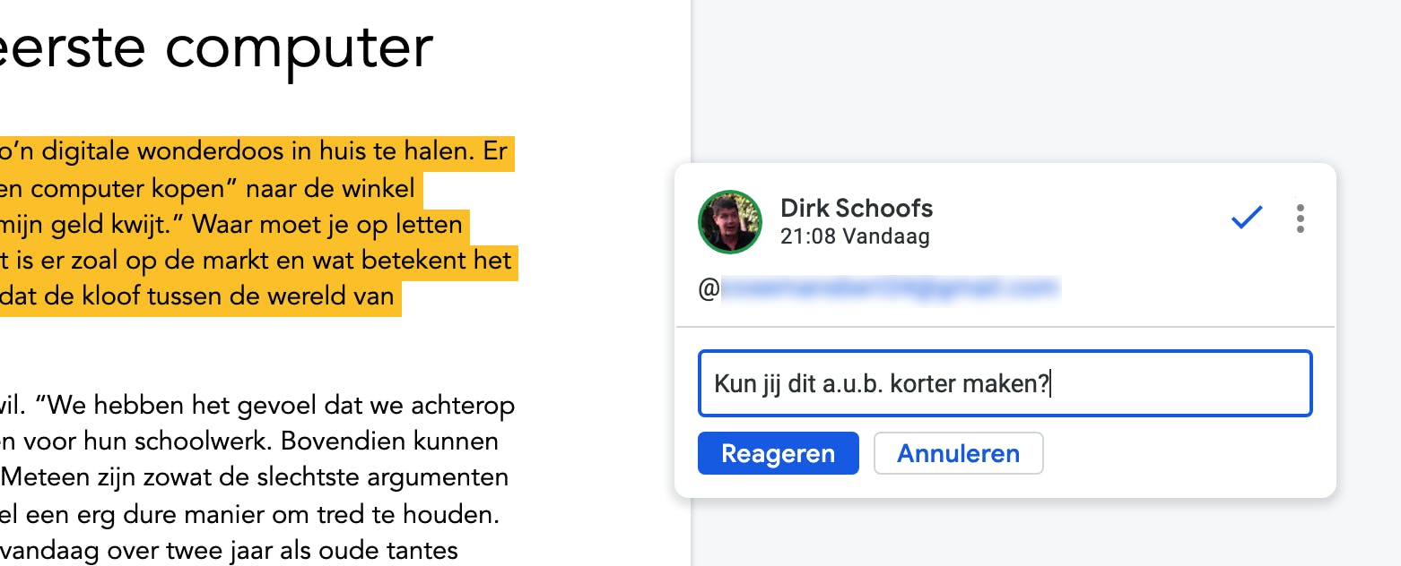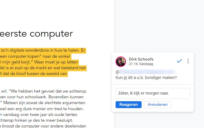 Door een opmerking toe te voegen, verschijnt er een pop-up. Typ daarin een plusteken of apenstaartje en selecteer de naam van degene(n) voor wie de taak bedoeld is. Daarna formuleer je het verzoek. Plaats vervolgens een vinkje in het vakje Toewijzen en klik nog een keer op de knop Toewijzen. Deze persoon krijgt dan een e-mail waarin staat dat jij hem een taak hebt toegewezen. In het document ziet hij dan de pop-up met jouw verzoek.