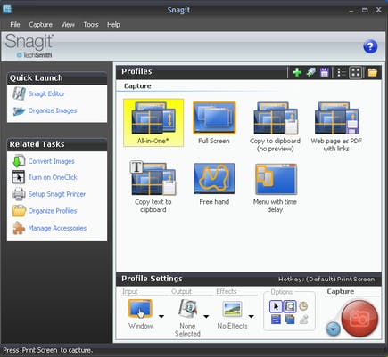 Op het eerste gezicht lijkt er nauwelijks iets veranderd, de gebruikersomgeving van Snagit 10 vertoont grote gelijkenis met versie 9. Wie echter beter kijkt, ontdekt al gauw de modus All-in-one, een van de welkome vernieuwingen. Waar u in vorige versies vooraf moest bepalen welke type schermafdruk u wilde maken (bijvoorbeeld van een venster of juist van het volledige scherm), is dit met de modus All-in-one niet meer nodig. Een kader met gele lijnen en een vergrootglas geeft aan van welk onderdeel een schermafdruk wordt gemaakt. U bepaalt dus ‘ter plekke’ de gewenste schermafdruk. Voor wie regelmatig schermafdrukken maakt, is deze functie alleen al een belangrijke (want tijdbesparende) reden om versie 10 beter te bekijken. De vorige ‘capture-profielen’, zoals Region, Window en Object, zijn ook nog aanwezig. Ze zijn ondergebracht in een aparte categorie met alle profielen van versie 9, mits u die versie van Snagit eerder hebt gebruikt.