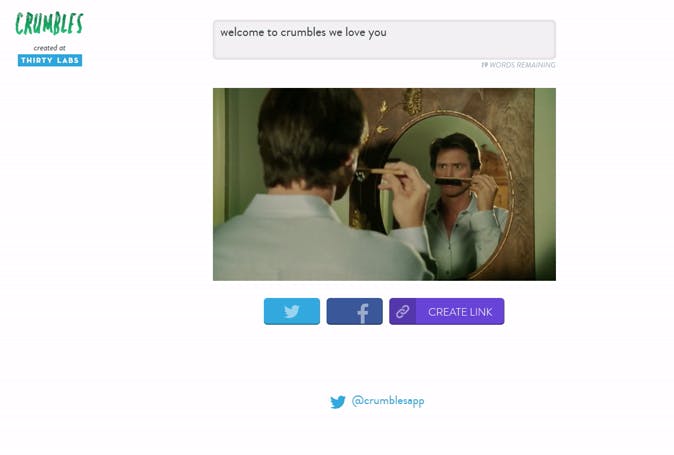 Wat deze app doet is even briljant als eenvoudig. En het mooie is dat, als je het met de hand zou moeten doen, je per filmpje een paar weken bezig zou zijn. Dankzij Crumbles ben je er in een paar seconden mee klaar. Wat de app doet, is getypte tekst omzetten in video, aan de hand van duizenden fragmenten uit films en televisieprogramma's. Het resultaat is verbluffend, vooral omdat het lijkt alsof er echt heel veel werk in zit.