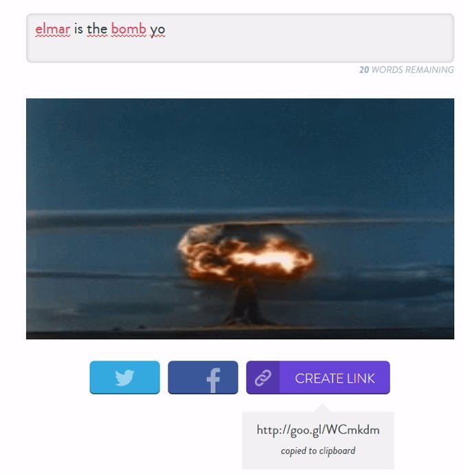 Wil je de video delen? Dan kan dat met de knop Twitter of Facebook onder het filmpje, of je kunt een link laten genereren met de knop Create link, die dan automatisch in je klembord wordt geplakt.