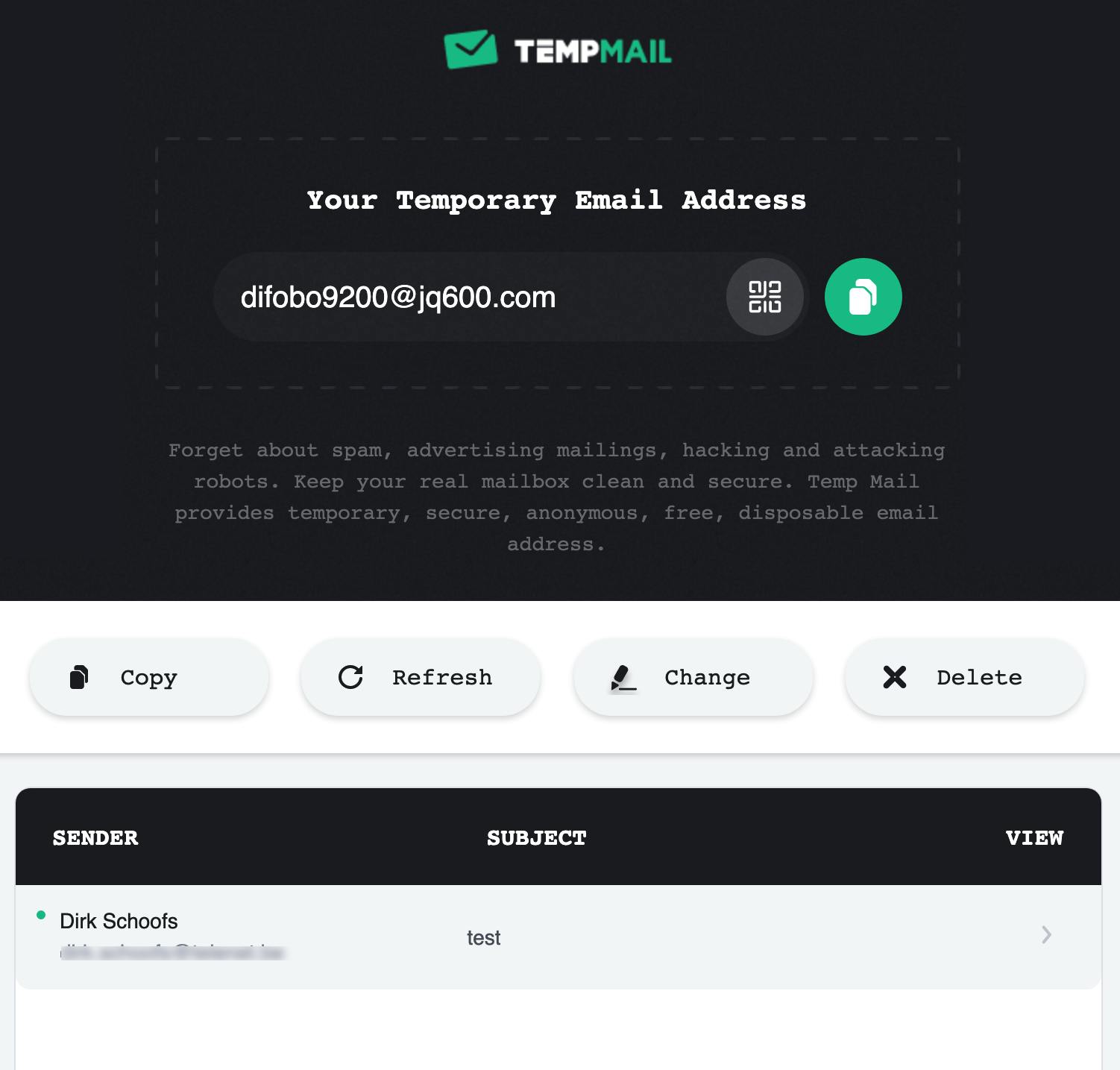 Als je deze webdienst op de mobiele telefoon gebruikt, dan kun je een QR-code genereren die je kunt scannen. Trouwens, TempMail is er ook in app-vorm voor iOS en Android.