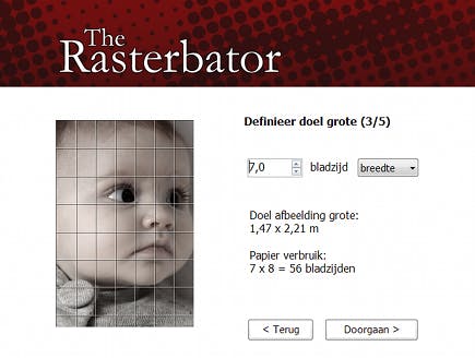 The Rasterbator werkt in vijf eenvoudige stappen. Allereerst moet u een bronafbeelding selecteren. Vervolgens dient u de papiergrootte, bijvoorbeeld A4, te selecteren en de doelgrootte. Een poster gedrukt op vijf pagina’s breed wordt bijvoorbeeld 1,05 meter breed. U kunt de grootte naar hartenlust aanpassen, u krijgt ook telkens het papierverbruik te zien. Wilt u een hoge foto uitrekken over een breedte van 7 pagina’s, dan krijgt u een poster van 1,47 bij 2,21 meter of 7x8 = 56 bladzijden. Nog groter? Kan ook!