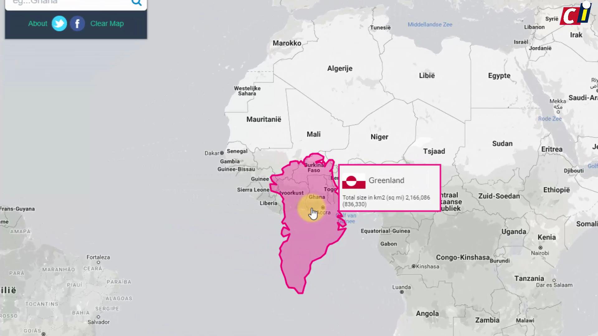 Bekijk op The True Size hoe groot een land precies is als je het vergelijkt met andere landen.