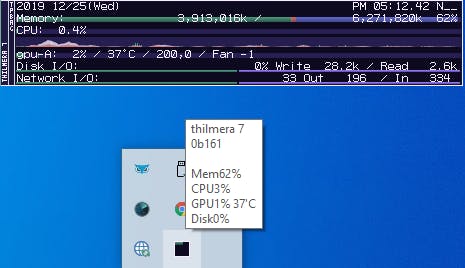 Het is wel even zoeken naar het juiste exe-bestand van deze portable tool (Thilmera7_64.exe). Na de opstart verschijnt een programma-icoon in het Windows-systeemvak. Wanneer je de muisaanwijzer hier boven houdt, krijg je het actuele gebruik van geheugen, cpu, gpu en schijf te zien. Een muisklik volstaat om deze informatie ‘live’ te zien verschijnen op een verplaatsbaar widget. Nogmaals klikken en het widget verdwijnt. Maar er is meer …