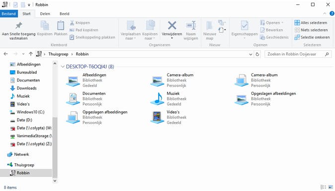 Nu de thuisgroep is ingesteld, kun je de gedeelde bronnen van andere apparaten gebruiken. Je vindt deze via Thuisgroep in Windows Verkenner. Bij de gedeelde bronnen zie je op welke computer ze worden gedeeld en hoe de Windows-gebruiker heet die de bronnen beschikbaar stelt. De computer waarop je gegevens wilt benaderen, dient aan te staan. Dit geldt ook voor een computer die een printer deelt met de thuisgroep. Gedeelde printers in de thuisgroep zijn automatisch beschikbaar als je een afdrukopdracht geeft op een van de andere computers.