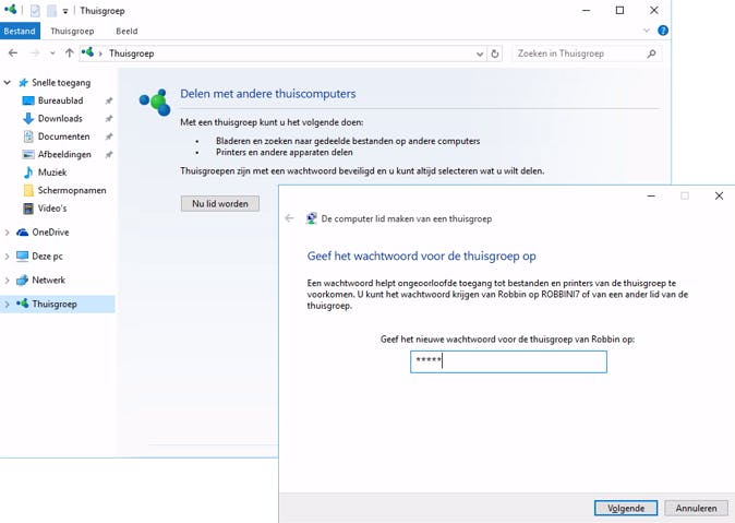 Last van vage storingen met je thuisgroep? Klik in Windows Verkenner met de rechtermuisknop op Thuisgroep en kies Probleemoplosser thuisgroep. Ben je het wachtwoord kwijt van je thuisgroep? Geen paniek! Open Windows Verkenner op een van je computers die nog verbonden is met je thuisgroep. Klik met de rechtermuisknop op Thuisgroep en kies Wachtwoord voor thuisgroep weergeven. Het wachtwoord verschijnt en kun je invoeren op de computer die je wilt toevoegen aan je thuisgroep.