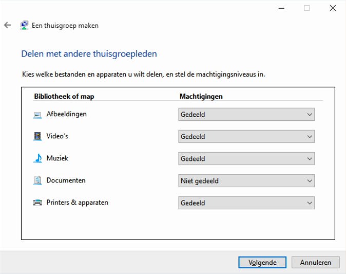 Als je tip 3 of 4 net iets te snel hebt doorlopen, deel je misschien per ongeluk meer bestanden dan je lief is. Je had de keuze om de volgende categorieën te delen: Afbeeldingen, Video's, Muziek, Documenten en Printers & apparaten. Alleen de categorie Documenten worden standaard niet gedeeld (optie Niet gedeeld). De overige bronnen zijn gemarkeerd als Gedeeld. Gelukkig kun je deze instellingen altijd wijzigen. Open Windows Verkenner en klik met de rechtermuisknop op Thuisgroep. Kies Instellingen voor thuisgroep wijzigen / Wijzigen wat u met de thuisgroep deelt. Verander de opties van Gedeeld naar Niet gedeeld voor de onderdelen die je niet beschikbaar wilt stellen.