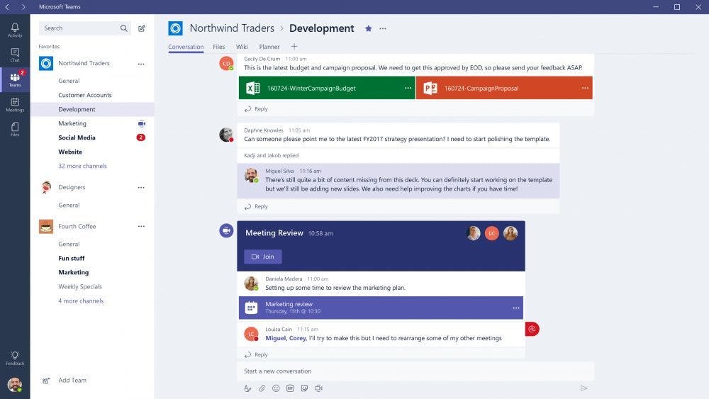 Microsoft Teams is niet een ‘chatprogramma’ waarbij je documenten kunt versturen: het is een samenwerktool. De documenten van Microsoft kunnen net als Google documenten in de browser worden geopend en real time door alle mensen waarmee het document gedeeld is (en die bewerkrechten hebben) worden aangepast. Er hoeven dus niet continu bestanden en versies over en weer worden gestuurd, want iedereen heeft altijd de meest recente versie bij de hand. Dat scheelt weer vragen over versies en de verantwoordelijkheid die iemand moet dragen om al die versies bij te houden en rond te sturen.