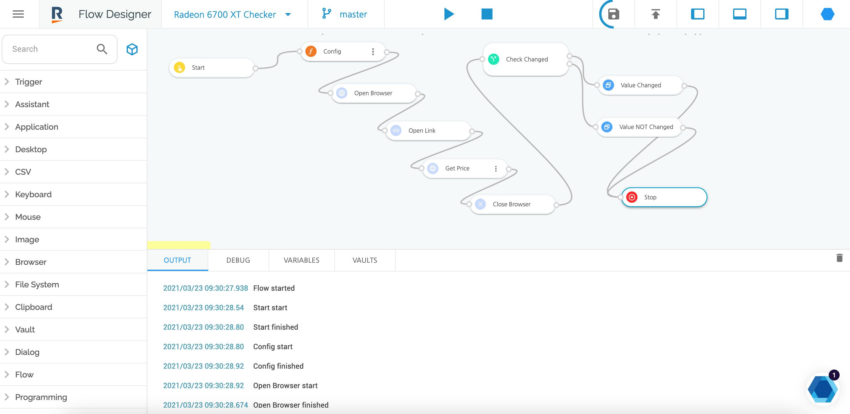 In ons geval hebben we bijvoorbeeld een prijschecker gebouwd om de beschikbaarheid van de gierend populaire Radeon 6700 XT-videokaart op de website van AMD te checken. Deze flow draait niet op het systeem van Robomotion, maar is een echte RPA-toepassing: je moet een helper-applicatie op je eigen pc, Mac of Linux-machine installeren die het werk doet, in dit geval de browser opstarten en de check doen.