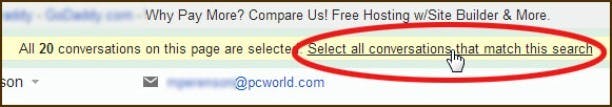 Je krijgt al snel een lijst met berichten te zien die aan je criteria voldoen. Klik op de Select-knop (aan de linkerkant van de Refresh knop). Hiermee selecteer je alle zichtbare berichten of discussies, maar waarschijnlijk niet alle berichten die aan je zoekcriteria voldoen. Dus zorg dat je eerst op de link Select all conversations that match this search klikt.