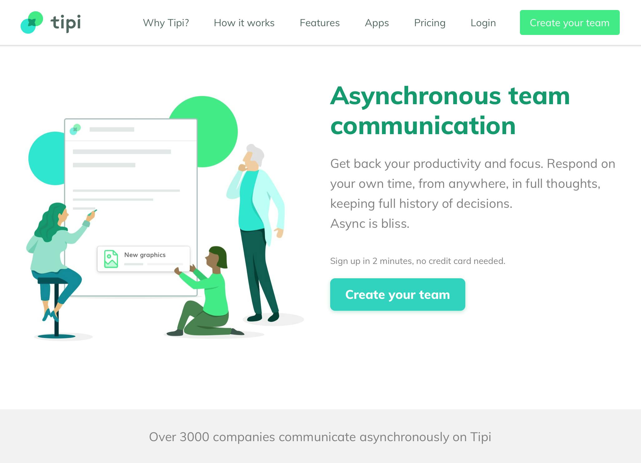 Dat dachten de makers van Tipi ook. Het is tijd om synchroon werken te verlaten en je aan te melden voor het asynchroon werken van Tipi. Dat klinkt spannend – Tipi legt uit dat synchroon werken betekent dat je constant van alles op de hoogte bent, en dus overal notificaties over krijgt via allerlei verschillende platforms. Gevolg: je komt geen steek verder. Tipi belooft ons asynchroon te werken: er worden alleen zaken gesynchroniseerd als jij dat wilt, bijvoorbeeld als je net een taak af hebt afgerond en even vijf minuten tijd hebt.