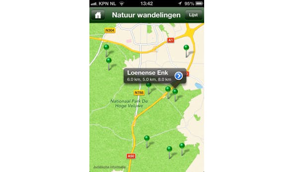 Kiezen we op het hoofdscherm van de app Wandelen in Nederland bijvoorbeeld de categorie Natuurwandelingen uit, dan zien we op een kaart waar we allemaal in onze wandelschoenen kunnen stappen. Tik op een speld en de wandelroute(s) op die locatie worden getoond. Heb je een mooie wandeling gevonden? Controleer dan of het startpunt staat aangegeven. Kijk ook of bekend is op welke manier je de route loopt, bijvoorbeeld door het volgen van gekleurde paaltjes.