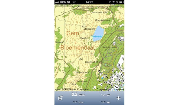 Of je nu hardloopt, wandelt of fietst, of met een kano op stap gaat, voor alle recreatieve bezigheden waarbij je de verharde weg verlaat, kun je bijna niet zonder topografische kaarten. Daarop staat elk weggetje, hazenpaadje, slootje, bruggetje, het soort landschap en alle bebouwing aangeven. Vroeger was daar een peperdure gps-ontvanger voor nodig met eveneens prijzig kaartmateriaal. Nu hoef je niets anders te doen dan de app Topo GPS van Rdzl Inc (3,59 euro) te kopen en kun je het zeer gedetailleerde topografische kaartmateriaal van het Kadaster van heel Nederland op je eigen iPhone raadplegen.