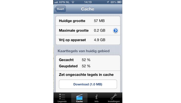 Bekijk, terwijl je met je draadloze thuisnetwerk verbonden bent, het gewenste gebied en tik met twee vingers tegelijk op de kaart. Ga dan naar het tabblad Cache en tik onder het kopje Kaarttegels van huidig gebied op Download. Je ziet hier direct om hoeveel gegevens het gaat. Bekijk je heel Nederland door volledig uit te zoomen, dan heb je tot zo'n twee gigabyte aan opslagruimte nodig. De grootte van de cache is trouwens in te stellen via Maximale grootte. Is de cache vol, dan wordt materiaal dat lang niet bekeken is vervangen door nieuw kaartmateriaal.
