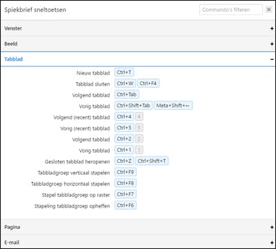 Als het aan de makers van Vivaldi ligt, gebruik je zo weinig mogelijk de muis. Er zitten rond de 100 sneltoetsen ingebouwd voor uiteenlopende functies, die je overigens ook zelf kunt aanmaken of veranderen. Tip: druk in de browser op Ctrl+F1 om een spiekfbrief te zien met daarin een overzicht van alle opties.