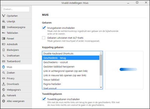 Navigeer je wel gewoon met de muis, dan kun je gebruik maken van muisgebaren. Dat doe je door de rechtermuisknop ingedrukt te houden en er bepaalde bewegingen mee te 'tekenen'. Zo open je bijvoorbeeld een nieuw tabblad door de muis omlaag te trekken. Of ga je een pagina terug door naar links te vegen.
