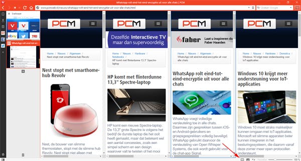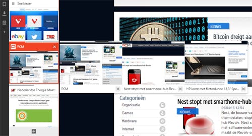 Verder kun je snel de verschillende tabbladen tegelijk weergeven door ze te stapelen. Met de stapelknop onderin de browser (rechts) bepaal je hier de layout van.