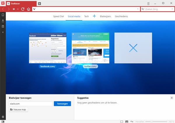 Open je Vivaldi of een nieuw tabblad, dan kom je standaard bij de Snelkiezer (Speed Dial) uit. Hier kun je websites opslaan die je vaak bezoekt, zodat je er snel bij kunt. Je kunt ze ook onderbrengen in subcategorieën die je zelf mag bepalen, zoals 'nieuws', 'social' of 'tech'. Tip: Je kunt o.a. de achtergrond van de snelkiezer aanpassen onder instellingen > snelkiezerpagina.