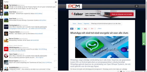 Dan nog een laatste trucje: Vivaldi laat je websites openen in zogenaamde webpanelen. Open je een site als paneel, dan blijft deze altijd actief naast de websites die je daarbuiten bezoekt. Een handige toepassing daarvoor is dat je bijvoorbeeld je Twitter-feed open kunt houden, terwijl je daarbuiten gewoon andere sites kunt openen.