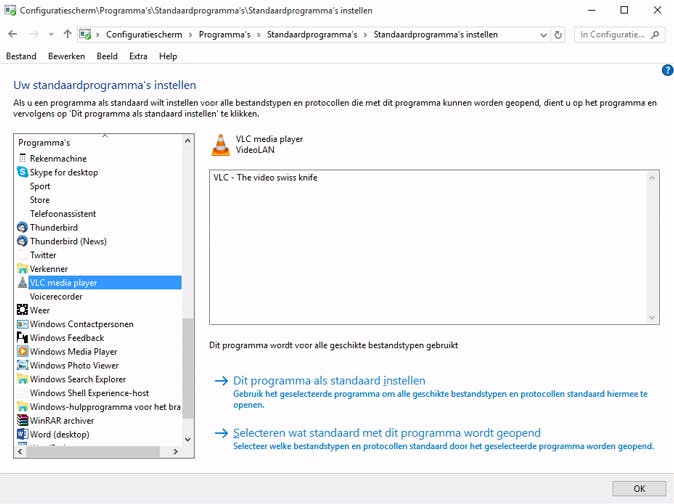 VLC speelt alles wat met videobestanden te maken heeft probleemloos af. Toch kan het gebeuren dat voor bepaalde bestanden een andere programma opstart zodra je dubbelklikt op een videobestand. Bekende programma's die zichzelf dit recht toe-eigenen zijn Windows Media Player en iTunes. In dat geval kun je opnieuw instellen dat VLC wordt gebruikt als je op een videobestand dubbelklikt. Ga naar het configuratiescherm van Windows en ga naar Programma's / Standaardprogramma's / Standaardprogramma's instellen. Zoek in de lijst naar VLC media player en selecteer deze door er op te klikken. Bevestig met Dit programma als standaardprogramma instellen.