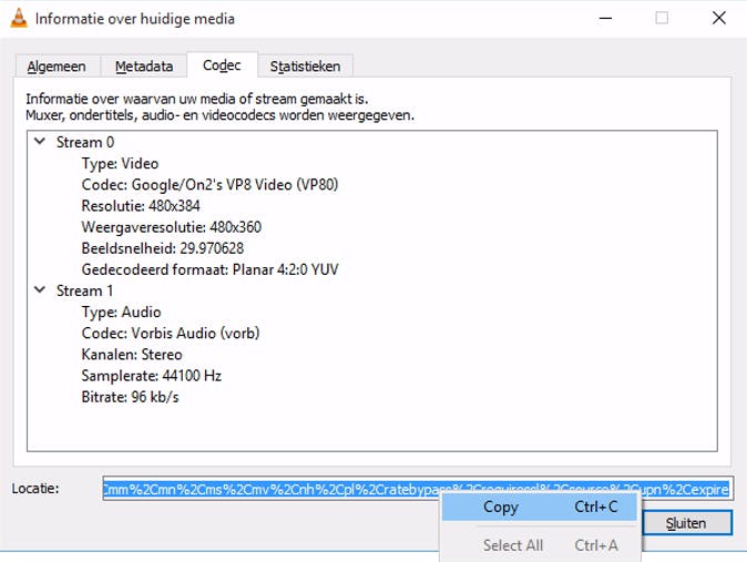 De meeste mensen die iets van YouTube willen bewaren op de computer grijpen naar Freemake of andere gratis programma's. We nemen geïntegreerde reclamenetwerken en soms zelfs spyware voor lief bij dit soort software, maar waarom zou je? Het kan ook gratis en veilig via een tussenstapje in VLC. Speel de video af zoals besproken bij de vorige tip. Ga in VLC naar het menu Extra / Codecinformatie. Onder in beeld zie je een lange cryptische link bij Locatie. Klik met de rechtermuisknop op deze link en kies Select all (alles selecteren). Kopieer het linkadres nu via Ctrl+C. Ga naar je browser en plak de link in het adresveld via Ctrl+V. Bevestig met Enter. Het filmpje begint af te spelen, maar dan zonder alle YouTube-kaders en andere opsmuk. Je mag het filmpje pauzeren. Klik in je browser met de rechtermuisknop op het filmpje en kies Opslaan als. Bewaar het videobestand op je computer als mp4-bestand.