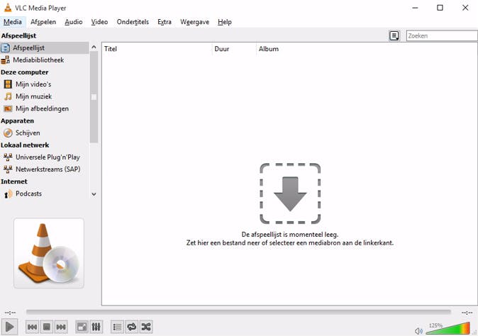 De meeste mensen kennen alleen het strakke minimalistische afspeelvenster van VLC, maar er is ook een uitgebreidere mediaspeler met meer functies. Deze vind je via Weergave / Afspeellijst (of sneltoets Ctrl+L). In de linkerkolom zie je een overzicht van de extra's, zoals Playlist, Mijn video's (met een verwijzing naar de inhoud van gelijknamige map) en diverse streamingopties. Er is zelfs een podcast-functie aanwezig voor wie dit handig vindt. Deze werkt goed, maar is wel Spartaans omdat je zelf het adres van de podcast-feed moet kopiëren/plakken.