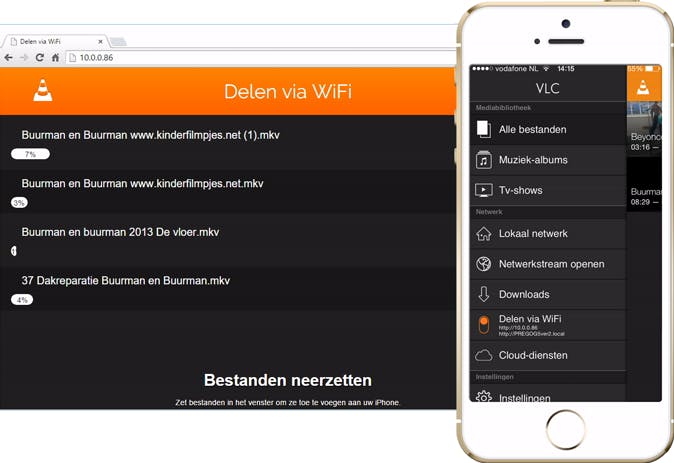 VLC is niet alleen handig op je pc, maar ook voor je smartphone of tablet. De functies van de iOS- en Android-app wijken behoorlijk af, maar ze hebben één ding gemeen: het is handige afspeelsoftware voor alle videobestanden. Bij Android-apparatuur kun je videobestanden (bijvoorbeeld mkv's) op je toestel krijgen via een SD-kaartje, bij iOS-toestellen is dat lastig. Voor dit laatste heeft de iOS-app van VLC een handige functie genaamd Delen via WiFi. Hiermee gebruik je de browser op je computer om (grote) videobestanden op je smartphone te krijgen en af te spelen: handig! De iOS- en Android-app vind je in de app-store van je platform.