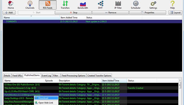 Via de RSS-functie kan direct van torrent-websites worden gedownload.