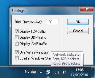 Nu is dat niet zo’n ramp, maar het blijft toch vreemd dat Microsoft dit subtiele en handige gedrag heeft verwijderd. Daarom heeft Igor Tolmachev zelf een tooltje geschreven dat het oude gedrag van het netwerkicoontje in Windows 7 terugbrengt: Network Activity Indicator. Als u dit icoontje zo instelt dat het altijd in het systeemvak staat (de optie Show icon and notifications in de instellingen van het systeemvak), kunt u gerust het dan nutteloze icoontje van Windows uit het systeemvak halen. In tegenstelling tot het netwerkicoontje in Windows XP toont het programma slechts één icoontje voor de inkomende en uitgaande netwerkpakketjes op alle netwerkinterfaces.