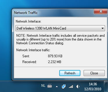 Network Activity Monitor is dus heel handig, maar het is wel te zien dat het een hobbyprojectje is. Blijft u met de muis boven het icoontje hangen, dan krijgt u het aantal verzonden en ontvangen pakketjes te zien. Helaas zegt het aantal IP-pakketjes de meeste mensen niet zo veel, en moet u rechtsklikken op het icoontje, vervolgens Network Traffic kiezen in het contextmenu en dan een netwerkinterface kiezen om het netwerkverkeer in KB of MB te zien te krijgen.