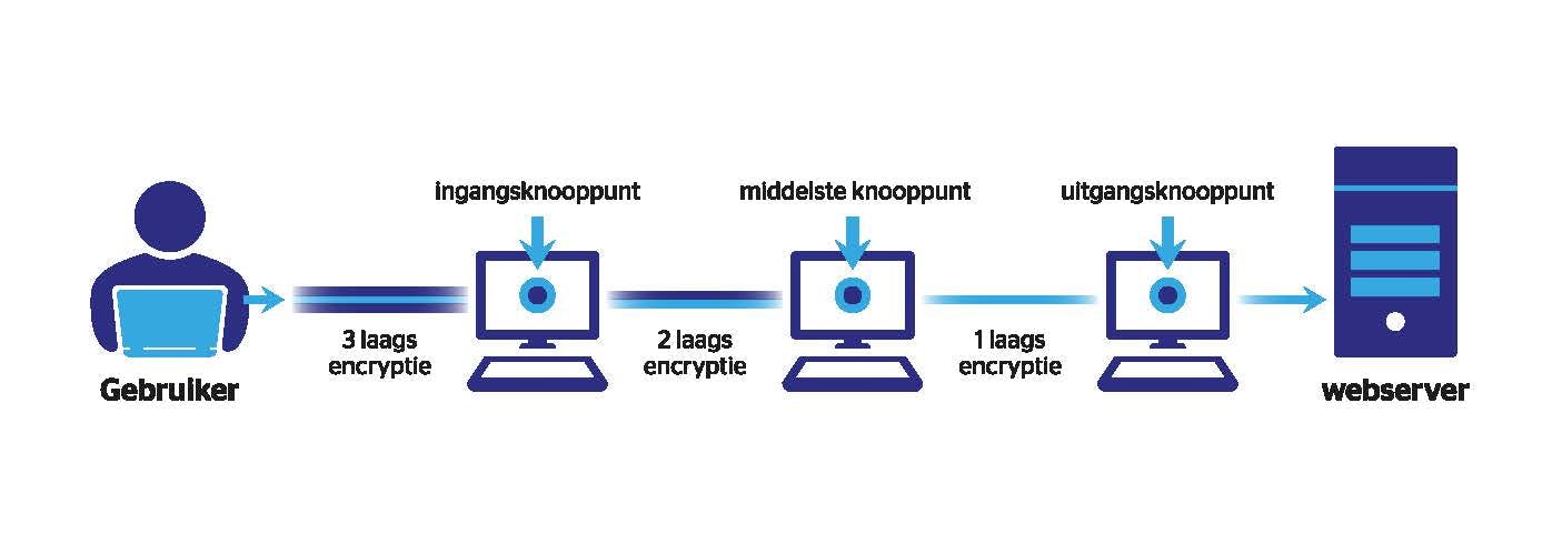 De middle node herhaalt dit proces en verwijdert weer een encryptielaag om het adres van de volgende server te onthullen. Deze server weet dus niet wie de oorspronkelijke verzender is en kent ook de inhoud van de data niet. De laatste node, de exit node, haalt de laatste encryptielaag eraf en stuurt je nu onversleutelde data naar de bedoelde webserver.
